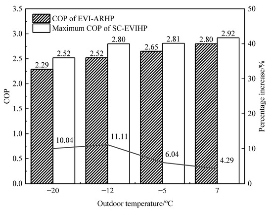 It can be seen from Figure 13 and Figure 14 that the heating capacity and COP of the SC-EVIHP system at different temperatures were improved with hot air. The heating capacity of the SC-EVIHP system improved by 3.9~10.9% and the COP improved by 6.1~11.1%. When the outdoor temperature was −5 °C, the maximum increase in heating capacity was 10.9% compared with the EVI-ASHP system. When the outdoor temperature was −12 °C, the COP reached its maximum increase of 11.1%. When the outdoor temperature was −20 °C, the COP of the SC-EVIHP system still increased by 10%. This indicates that the SC-EVIHP system is more suitable and energy-saving in cold areas.