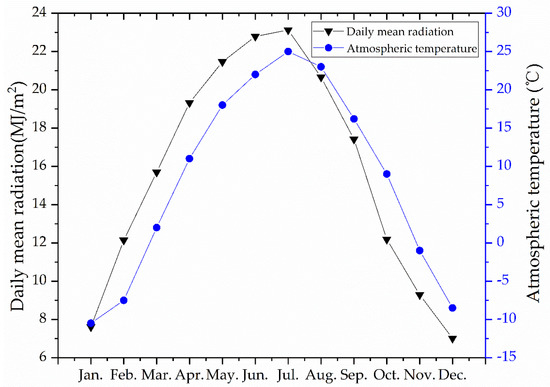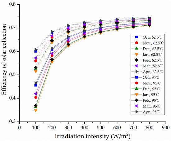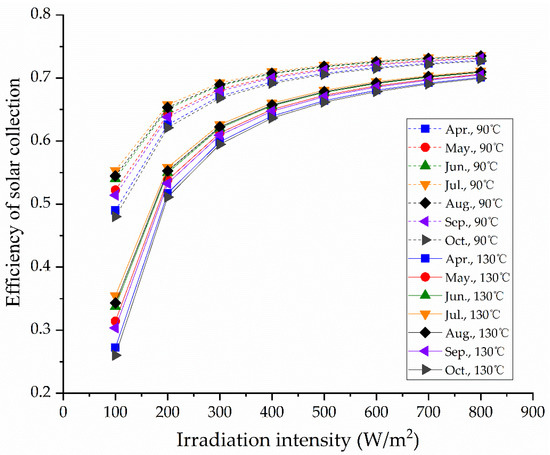 Equation (1) [17,20] describes the efficiency of solar collection. Meteorological parameters and hourly daily irradiation intensity are shown in Figure 2, Figure 3 and Figure 4 for the Chifeng City of China. The irradiation intensity increased and then decreased on any day. Furthermore, Figure 5 and Figure 6 show that solar collection efficiency varies with different irradiation intensities and heat-collection temperatures. The efficiency increased with an increase in the irradiation intensity when the heat-collection temperature was constant. The efficiency decreased with increased heat-collection temperature when the irradiation intensity was constant. The heat-collection temperature greatly affected the efficiency under a lower irradiation intensity. To improve the collection efficiency of solar energy, the system collected high- and low-temperature heat at high and low irradiation intensities, respectively. The energy of the solar collection can be calculated using Equation (2). The average collection efficiency of solar energy can be calculated using Equation (3).