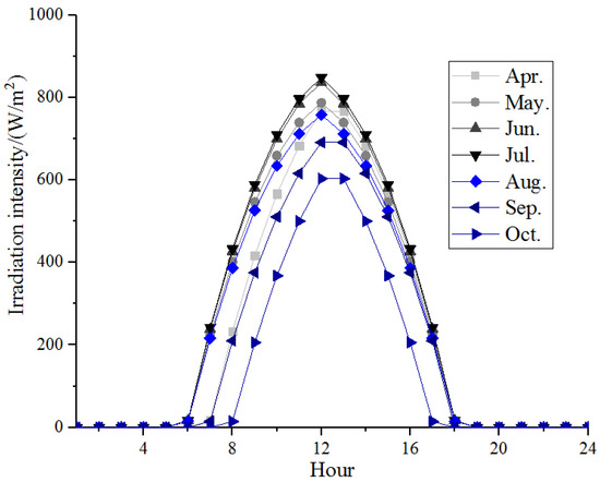 - The average irradiation intensity of solar energy and the average atmospheric temperature were specified for any hour;