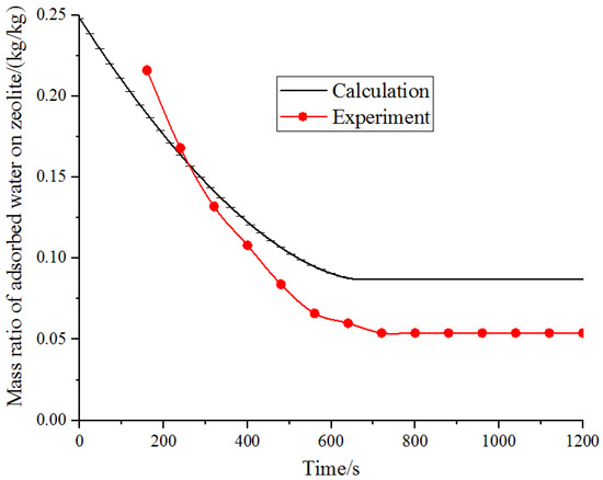 As shown in Figure 7, the transient physisorption capacity of the zeolite in the desorption process obtained using the mathematical model and experiment [29] was in good agreement. Thus, it can be seen that the proposed model is adaptable.