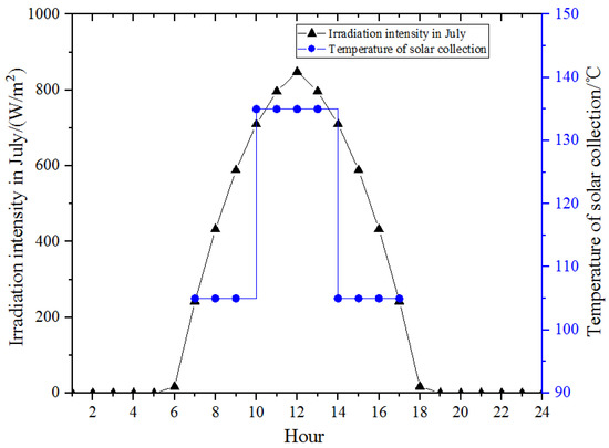 A typical day in each month was selected to show the characteristics of the charging process in detail. Figure 9 shows a schematic of the temperature of the solar collection on a typical day in July. The system collected high- (135 °C) and medium-temperature (105 °C) heat under high and low irradiation intensities, respectively. The durations for solar collection at 135 °C and 105 °C were planned based on half of the heat of the collection because this value best reflects the characteristics of the proposed collection mode.