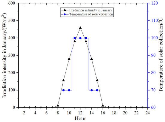 A typical day in each month was selected to reveal the characteristics of the discharging process in detail. Here, Figure 10 shows a schematic of the temperature of the solar collection on a typical day in January. The system collected medium- (100 °C) and low-temperature (70 °C) heat under high and low irradiation intensities, respectively. The duration of solar collection at 100 °C and 70 °C was planned based on half of the heat of the collection.