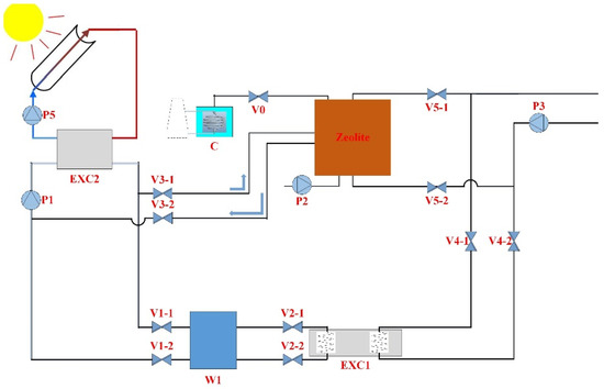 Here, Figure 11 shows a conventional solar-heating system with STES based on zeolite water. In the non-heating season, the solar heat-collection and zeolite adsorption subsystems worked, while the TES, energy release, and heating subsystems did not work. In this operating mode, valves V3-1, V3-2, and V0 were opened. Collected solar energy was eventually stored in the zeolite adsorption reactor. In the heating season, the system adopted heat storage and heat release. During the charging process, high-temperature heat was stored in tank W1, and valves V1-1 and V1-2 were opened in this operating mode. During the discharging process, the backwater was heated using the stored heat, and then, it was used for heating when the heating load was low or when the solar energy was abundant. Valves V2-1, V2-2, V4-1, and V4-2 were opened in this operating mode. The backwater was heated using the stored heat and zeolite adsorption heat simultaneously, and then it was used for heating when the heating load was high, or the solar energy was insufficient. An exothermic adsorption reaction occurred in the reactor, and the dry zeolite became wet. Valves V2-1, V2-2, V4-1, V4-2, V5-1, and V5-2 were opened in this operating mode.