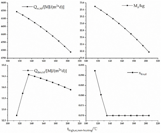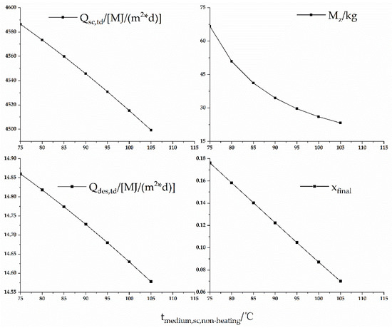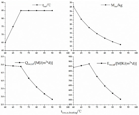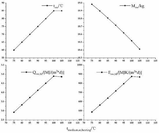 Here, Figure 15 shows the variations in the temperature, the mass, the heat and the entransy of supply water with the medium temperature of solar collection during the heating season. As observed from the figure, the mass of the supply water decreased with the increase in the medium temperature of solar collection in the heating season. This is because the heat of solar collection at low temperatures decreased. At half of the total heat of solar collection, the heat of solar collection at low temperatures decreased. However, the supply water temperature first increased and then remained unchanged. When the medium temperature of solar collection in the heating season was less than 100 °C, the temperature of the supply water increased. This is because of the limitation of temperature difference of heat exchange. When the medium temperature of solar collection in the heating season was greater than 100 °C, the temperature of the supply water remained unchanged. This is because the heat of solar collection at medium temperature was limited and was equal to half of the total heat of solar collection in the heating season.