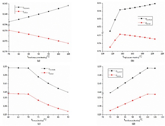 - According to the sensitivity analyses of the proposed system, the utilization efficiency of solar energy for a full year is generated when the high temperature of the solar collection is 135 °C during the non-heating season under the specified conditions. Similarly, the utilization efficiency of solar energy full year is generated when the medium temperature of solar collection is 100 °C during the heating season when the other parameters remained unchanged.