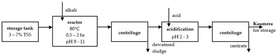 However, some industrial installations are also operated, e.g., in the Netherlands, a commercial company produces EPS in the form of Kaumera Gum. A full-scale installation was opened in the Netherlands in 2019 in the WWTPs, according to Zupthen [44]. The technology applied in the installation is presented in Figure 1. Collected sewage sludge of 3–7% TSS is stored in a special tank. The process of EPS isolation from the sludge begins by heating alkalized to pH 9–11 sludge to 80 °C for 0.5 to 2.0 h. To separate the centrifugate from the sludge, centrifugation is applied. A supernatant, which contains EPSs, is then acidified to precipitate the product EPS Kaumera. The remaining dewatered sludge is managed separately. EPS Kaumera is separated from the liquid phase via centrifugation. The ready product, acidic Kaumera, is then stored and can be treated in various ways. Further treatment can provide dialysis against ultrapure water for 24 h and the extract EPS in acidic form by adding 1 M HCl, followed by centrifugation. The product is a gel-like pellet. Additionally, a sodium or potassium form can be obtained by adding NaOH or KOH [37].