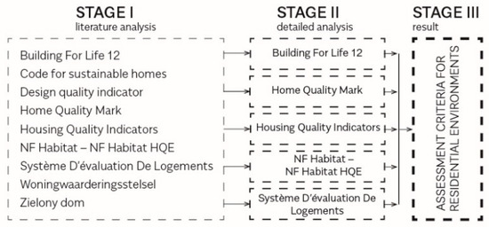 The main objective of this article is to analyze selected multi-criteria assessment systems that are applied in Europe in order to evaluate the quality of housing environments. These studies should be classified as fundamental in relation to the human-built environment. To achieve the research aim, the paper is divided into the stages described below, as shown in Figure 1.