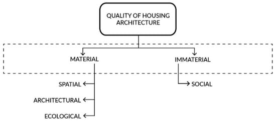 For each of the five systems that are described, the same information about the methods of using the system will be presented, the criteria for evaluating the system, and the system’s applicability. The systems were selected based on the availability of research material, the variety of examples, and their potential for use in the design of housing environments. Quality factors were divided into the following categories: (i) architectural, (ii) spatial, (iii) ecological, and (iv) social, as shown in Figure 2.