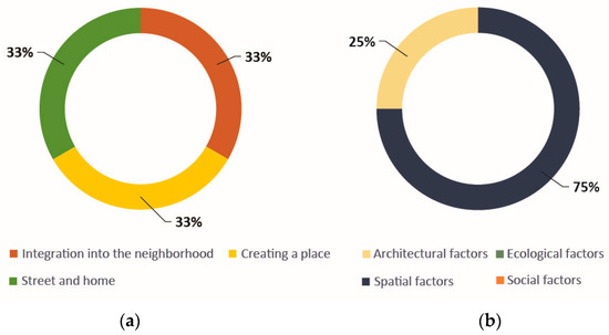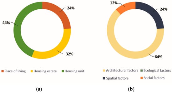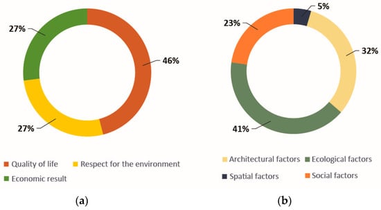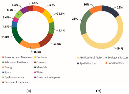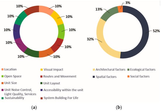 (a) % share of categories when evaluating quality. (b) System % share by type of factor: spatial (P), architectural (A), ecological (E), and social (S).