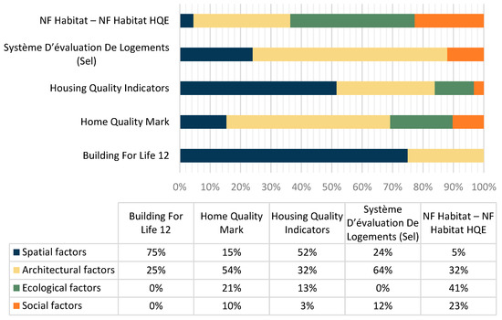 The systems that have been studied for analyzing and evaluating housing environments demonstrate real effectiveness in the designs (or modernizations) of housing projects in which they have been used. However, for the systems to achieve their purpose, it is crucial that the investor and designer work together to receive the best possible result in the evaluation system they have used. All the systems are different, with some focusing more on spatial factors and others expanding more on the architectural factors of the housing environment, as shown in Figure 8. This is due to the different goals that the authors wanted to achieve by introducing the new system. For example, the authors [58] of the BFL 12 system were looking to design user-friendly spaces, whereas the authors of the HQI system wanted to improve living conditions in social buildings.