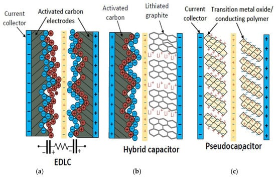 Electro-chemistry of three commercial SC families: (a) Electric double layer capacitor, (b) hybrid capacitor, (c) pseudocapacitor [11,12].