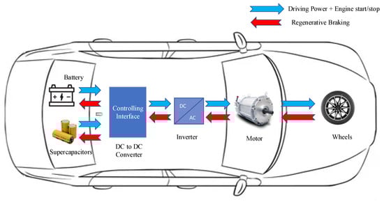 In modern EVs or hybrid EVs, the kinetic energy is converted to electrical energy during the braking by driving the motor as a generator. As shown in Figure 5, reverse power flow is directed to the SC and the battery. This RB method extends the driving range of an EV or improves the fuel economy of a hybrid EV [38]. Nevertheless, directing the rapid energy recovery during RB into the battery itself can cause stress on the battery, and its long-term performance will degrade [39]. SCs are used as an alternative method to capture the regenerative energy, which is ideal for work during rapid high-power variation situations. With the use of the configurations discussed in Section 5.1.1, all or part of the regenerative energy can be diverted into SCs, depending on the requirement. Most of the major car manufacturers use SCs to capture the energy from the RB. Toyota Supra and FCHV, Mazda 6 and 3, Hyundai Tucson, and Chevrolet Equinox are a few examples [40]. A project demonstrated that the deployment of the RB into the trolley bus system in Ningbo, China, by using a 1500 V SC pack, improved the driving range from 4 to 10 km [41].
