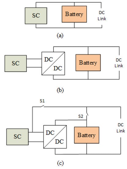 In the passive configuration, as shown in Figure 6a, the battery and the SC are connected directly in parallel to the DC link [32]. Although this configuration is the simplest and most economical method due to the absence of any intermediate DC-to-DC converters, it has some disadvantages [33]. For example, the terminal voltage always follows the discharging characteristics of the battery, which limits the usage of SC voltage. Similarly, the battery requires to supply both load and the SC soon after the SC discharges, which creates additional stresses on the battery [33].
