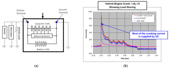 Maxwell Technologies’ Continental Automotive Systems’ Maxwell-powered voltage stabilization system (VSS) is one of the well-established automotive applications where SCs are used for the engine start-stop function. This technique used in Cadillac ATS, CTS sedans and ATS coupés [46]. As shown in Figure 7a, six 2000F ultracapacitors (UCs) are connected parallel with a 30 Ah battery to assist the battery during the start and stop [47]. As shown in the performance curves in Figure 7b, most of the starting current is supplied by the UCs, alleviating stress on the battery.