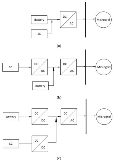 Supercapacitor + battery hybrid topologies used in microgrids (a) passive topology, (b) semi-active topology, and (c) active topology [51].