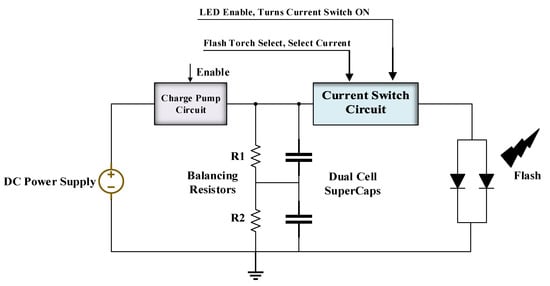 Figure 10 depicts a dual-cell SC-based camera flash system [58,59]. This circuit is activated through a series of external commands, such as activation of the charge pump circuit to charge the SCs, LED enabling, flash torch selection, and flash current limiting. Once the charge pump circuit is enabled, the SCs are charged, and when the flashlight drive is enabled, the SCs release high instantaneous power into the flashlight. The balancing resistors ensure that the voltage on each cell is equal to half of the output voltage to prevent an overvoltage condition on either cell. Some flashlight driver chip manufacturers often use active balancing circuits instead of resistors to minimize the losses and reduce the self-discharge [59]. The current switch solid-state circuit ensures that the right amount of light is provided for high-quality photography. Additionally, it provides a current limiting function, overload protection, and a steady and consistent range of the flash.