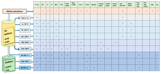 Typical analysis scheme of petroleum characterization by means of crude oil assay. Note: The sign • means performance of measurement of the property shown in the first row of the table of Figure 2.