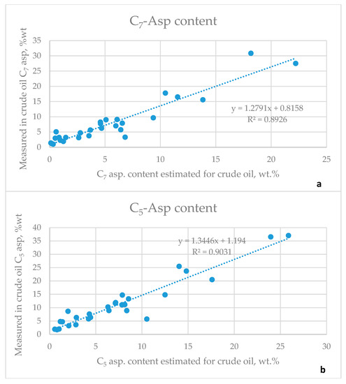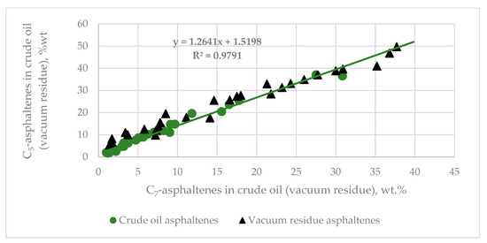 The data in Table 1 indicates that the bulk properties of petroleum crudes can vary in a very wide range. For example, the minimum density of petroleum crude of 0.746 g/cm3 [45] corresponds to the density of medium naphtha (fr. 100–150 °C) as evident from the data in Table S1. Whereas the maximum density of petroleum crudes of 1.119 g/cm3 is very close to the density of the heaviest and most polar fraction of the crude oil—asphaltenes [48]. The minimum molecular weight of petroleum crude of 117 g/mol. is within the range of the naphtha fraction [49], while the maximum molecular weight of petroleum crude of 652 g/mol. is within the range of the vacuum residue fraction [26,50]. The range of variation of the properties between the different crude oils can be so wide that in some cases the same property cannot be measured by the use of a single standard method (nitrogen, metals, viscosity, density, etc.) and different approaches are searched to obtain reliable values for the same petroleum property [51,52,53]. The petroleum maximum content of C7-asphaltenes of 43.0% [46] is much higher than that of the heaviest, the highest boiling point fraction—vacuum residue of the crude oils displayed in Table S1. The C7-asphaltenes are concentrated in the crude oil vacuum residue. The distilled fractions usually do not exhibit presence of C7-asphaltenes, and therefore one may expect that the crude oil asphaltene content would be equal to the multiplication of the petroleum vacuum residue content and the vacuum residue asphaltene content. However, our recent study indicated that asphaltenes as solubility class petroleum components do not always obey the additive rule [54]. In order to test whether the crude oil asphaltene content can be predicted from the vacuum residue asphaltene content and TBP yield we performed analyses of asphaltene content in both crude oils and derived thereof vacuum residues. We also measured asphaltene content in the lighter than vacuum residue, vacuum gas oil fractions and detected no asphaltene content therein. No published reports were found examining the application of the additive rule to predict crude oil asphaltene content from that of the vacuum residue multiplied by the vacuum residue TBP yield. Table 2 presents data of content of C5-, and C7-asphaltenes in 28 crude oils and their vacuum residue fractions and juxtaposes the measured against estimated asphaltene contents using the additive rule (multiplication of the petroleum vacuum residue content by the vacuum residue asphaltene content). Figure 3 exhibits graphs of measured versus estimated C7- and C5-asphaltene contents using the additive rule. From this data it could be deduced that the crude asphaltene content could be predicted from the TBP vacuum residue yield multiplied by its asphaltene content. The data in Figure 3 also shows that the measured asphaltene content is in general higher than that of the estimated one, probably because of the poorer solubility power of the crude oil maltene fraction, than that of the vacuum residue maltene fraction. Another interesting finding taken from the data in Table 2 concerning the relation of C5- to C7-asphaltenes is depicted in Figure 4. It is evident from this data that the ratio between C5- and C7-asphaltenes in both parent crude oils and the derived thereof vacuum residue fractions is the same. This data also shows that if information of the content of C7-asphaltenes is available then the content of C5-asphaltenes can be computed from the regression equation shown in Figure 4. Furthermore, the difference between C5-, and C7-asphaltenes determines the n-heptane soluble, n-pentane insoluble, that is the n-pentane insoluble resins. In this way in case of available information about saturate content in the crude oil, and C7-, or C5-asphaltenes, the full SARA (saturates, aromatics, resins, asphaltenes) composition can be obtained.