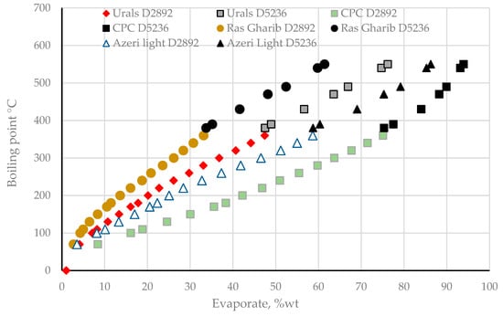 The true boiling point (TBP) distillation analysis is the heart of the petroleum crude characterization process because it provides information about the quantity of the different fractions, which are treated in the different refinery plants such as isomerization, reforming, hydrotreatment, fluid catalytic cracking, hydrocracking, etc. [55,56,57,58,59,60,61,62,63,64,65,66,67,68,69,70,71,72,73,74,75,76,77,78,79,80,81,82,83,84,85,86,87,88,89,90]. It also provides quantity of the different petroleum fractions to be further analyzed for their characteristics (Figure 2) [11,36]. Typically, the crude oil TBP analysis is performed in accordance with the standards ASTM D 2892 (crude oil distillation under atmospheric pressure) and ASTM D 5236 (atmospheric residue distillation under vacuum). The TBP analysis of a crude oil is usually performed for three days. Two days lasts the ASTM D 2892 analysis, and a day is required to complete the ASTM D 5236 analysis. Graphs of the TBP distillation curves of extra light (CPC), light (Azeri Light), medium (Urals), and heavy (RasGharib) crude oils are depicted in Figure 5.