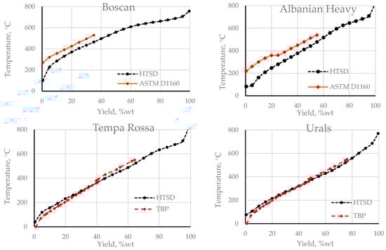 The data in Figure 6 exhibits that the high temperature simulated distillation (HTSD, ASTM D7169) reports lower yields for the fractions boiling below 360 °C (the atmospheric part of the TBP—ASTM D 2892) and higher yields for the fractions boiling above 360 °C (the vacuum part of the TBP—ASTM D 5236) for the heavy-extra heavy, heavy, and medium crude oils.