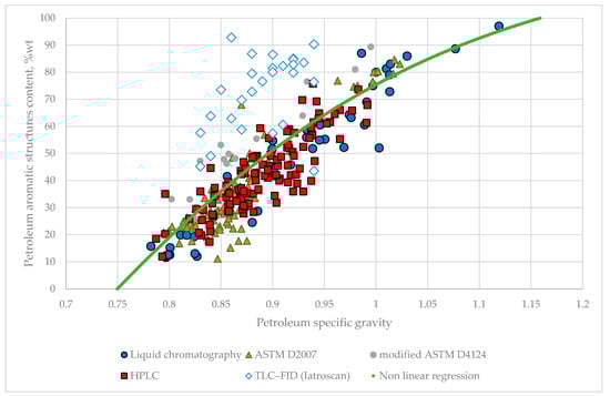 In order to investigate the presence of statistically meaningful relations between the SARA fractions measured by the five methods used for oil group hydrocarbon composition analysis, intercriteria analysis (ICrA) evaluation for all methods was performed. The results of ICrA evaluations are summarized in Tables S6–S15. The ICrA approach has been applied in several our studies to search for statistically meaningful relations in petroleum characterization and refining [9]. More detailed explanation of the essence of ICrA and its application in petroleum refining the reader can find in our recent study [54]. Here, we summarize the meaning of the values of positive and negative consonance (μ) and (υ) applied in ICrA evaluation of the studied petroleum property relations. The meaning of μ = 0.75 ÷ 1.00; υ = 0 ÷ 0.25 denotes a statistically meaningful significant positive relation, where the strong positive consonance exhibits values of μ = 0.95 ÷ 1.00; υ = 0 ÷ 0.05, and the weak positive consonance exhibits values of μ = 0.75 ÷ 0.85; υ = 0.25 ÷ 0.15. Respectively, the values of negative consonance with μ = 0.00 ÷ 0.25; υ = 0.75 ÷ 1.00 means a statistically meaningful negative relation, where the strong negative consonance exhibits values of μ = 0.00 ÷ 0.05; υ = 0.95 ÷ 1.00, and the weak negative consonance exhibits values of μ = 0.15 ÷ 0.25; υ = 0.75 ÷ 0.85. From the data presented in Tables S6–S15, it can be seen that all the methods for SARA analysis of crude oil except thin layer chromatography (correlation analysis) show statistically significant relationship between saturate components and aromatic structure contents with the specific gravity of crude oil. The ASTM D 2007, ASTM D 4124 and high-performance liquid chromatography methods show a moderate statistically significant relationship between the saturate components and aromatic structure content and the specific gravity of the crude oil, and the liquid chromatography method demonstrates a strong statistically significant relationship between these crude oil parameters. A similar relationship between specific gravity and the content of saturate components and aromatic structures was found in our recent study for vacuum residues derived from all groups of oil types [135]. From this it can be concluded that the specific gravity of crude oil and petroleum derivatives is a major indicator characterizing the chemical nature of oil. By using the nonlinear least squares method, a mathematical relationship was derived relating the specific gravity of crude oil to the content of aromatic structures. This relationship is shown by Equation (7) and in Figure 7.