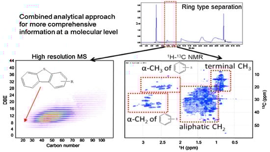 Integration of three analytical techniques, high-performance liquid chromatography (HPLC) ring-type separation, two-dimensional nuclear magnetic resonance spectroscopy (2D NMR), and ultrahigh-resolution mass spectrometry (MS), for molecular-level characterization of crude oil was employed by Kim et al. [238] for detailed characterization of its compositions (Figure 9).