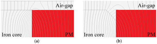 The operation principle of the chamfered structure is illustrated in Figure 3. As can be seen, in regular CP structure, the flux leakage between the PMs and the rotor teeth is very severe, which wastes part of the MMF of the PMs. In the proposed chamfered structure, the magnetic path between the adjacent PMs and rotor teeth is lengthened. In this way, the flux leakage can be alleviated. As is shown in Figure 3b, the flux lines are more apt to cross the air-gap, so the working flux linkage can be increased.