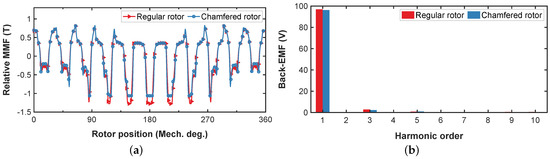 According to the flux modulation principle [15], both the fundamental and modulated components of the flux density influence the induced voltage in the coil. From Figure 6, it can be found that the proposed structure has larger fundamental harmonic (eleventh order) and modulated harmonic (first order). It is concluded from the ideal condition that the chamfered CP structure has an advantage over the regular CP structure. Meanwhile, the proposed improvement on the CP is very simple and will not influence the mechanical strength of the rotor.
