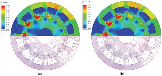 The flux contour distributions of the proposed machine and the regular candidate are shown in Figure 7. As is illustrated, in the proposed topology, the saturation in the stator yoke is alleviated. In Figure 7a, there are some saturation regions in the rotor teeth, which is exactly the chamfered part. In Figure 7b, the saturation problem does not exist. The flux lines also show that the flux leakage in the rotor is reduced.