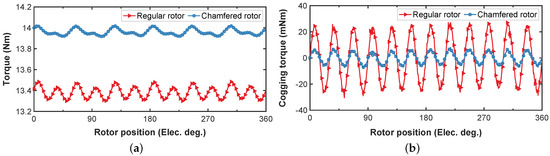 The comparison of torque performances is given in Figure 8. As Figure 8b shows, the cogging torque magnitude of the regular CP structure is 25 mNm, and that of the proposed structure is only 6 mNm. It indicates that the proposed structure has an inherent property of low torque ripple. The average torque of the regular CP structure is 13.4 Nm, and that of the proposed structure is 14.0 Nm. The peak-to-peak value of torque ripple of regular CP structure is 0.18 Nm, and that of the proposed structure is 0.1 Nm. Figure 8a shows that the chamfered structure can provide larger torque with a lower torque ripple.