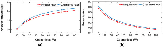 Figure 9b shows that when the mechanical speed remains constant, the power factor decreases with the copper loss. The proposed structure has a higher power factor over the whole loss range, the reason of which is that the proposed structure has less flux leakage.