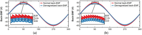 Furthermore, the demagnetized back-EMF characteristics of both candidates are also compared. Taking the 20 W working condition for example, if the control strategy is adopted, the value of is 9.7 A. If the three-phase short circuit fault happens, the peak d-axis current is −28.6 A. As is shown in Figure 10, after current demagnetization, the back-EMF drop of the proposed machine is 5.5%, and that of the regular machine is 7.3%. The results show that the chamfered structure is also beneficial to the anti-demagnetization characteristic of CPVPM machine.