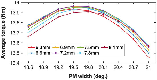 Essentially, the stator tooth and PM width influences the allocation between winding current and magnetic flux. The influence of combinations of stator tooth width and rotor PM width is shown in Figure 13, where each curve represents a tooth width. From the plots it can be found that, the stator teeth width cannot be too small, because it will cause the saturation problem. If the stator teeth width is too large, the place for stator winding will be reduced. As can be concluded, the 19.8 degree/7.2 mm combination is the optimal choice.