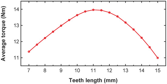 The stator tooth length is another valuable parameter. It will influence the thickness of the stator yoke and armature winding area. When the tooth length gets larger, the stator yoke will be thinner. Consequently, the saturation problem will also restrict the torque production. As is shown in Figure 14, the optimal value of the tooth length is 11 mm.