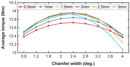 Last but not least, the the impact of chamfer shape on average torque is given in Figure 15. As has been discussed in Section 2, the chamfer shape can change the harmonic amplitude of the air-gap permeance and influence the produced torque. As can be seen, the chamfer shape with 2.4 degree width and 1.5 mm length is the most suitable combination.