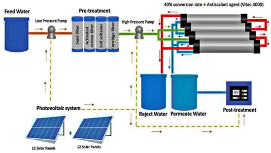 In an attempt to reduce the problem of high RO costs, much research has focused on RO desalination powered by renewable energies such as wind, ocean waves, solar and geothermal power to make this process affordable for low-income regions [25]. The most commonly used renewable energy has been solar PV [9] since it is easy to install and cheaper compared to other technologies. In addition, regions with a shortage of water are generally regions with high solar irradiation, making them suitable for solar PV implementation. For example, Alghoul et al. [26] designed, constructed, and tested a small-scale brackish (2000 mg L−1) water (BWRO) desalination unit powered by a 2 kWp PV system. They found that the PV system supplied the load without disturbances, while the RO unit showed stable levels of permeate flow and salinity. Elmaadawy et al. [27] modeled the off-grid power systems for a 1500 m3 d−1 RO desalination plant, and they proposed a photovoltaic/wind/diesel/battery/convertor system and found a 62% energy cost reduction. Eltamaly et al. [28] designed a hybrid energy system (wind turbines, PV and batteries) to operate a 1000 m3 d−1 RO desalination plant. They found similar water production costs to a RO desalination plant powered by fossil fuels.