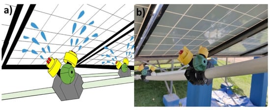 The spray cooling system consisted of 96 nozzles installed in the 24 fixed array PV modules (Figure 2), using water as a cooling fluid and spraying it uniformly on the back surface of the PV panels. Four nozzles were installed in each PV module, two in the vertical and two in the horizontal position. The total volume of sprayed water was 60 L, with repetitions every 30 min from 10 a.m. to 4 p.m. using a ½ HP submersible pump (Aquex 20AQD05121) and a hydropneumatic tank (Aquex TPQH-26). The cooling water was supplied from a hydropneumatic tank (Aquex TPQH-26). The total pumping distance was 80 m, and the pipe used was made of rigid plastic with a diameter of 2.5 cm. The cooling system was closed, with no loss of water volume. Spray cooling tests were conducted in the winter (13–18 January 2021), spring (6–14 May 2021), and summer (9–14 September 2021) seasons.