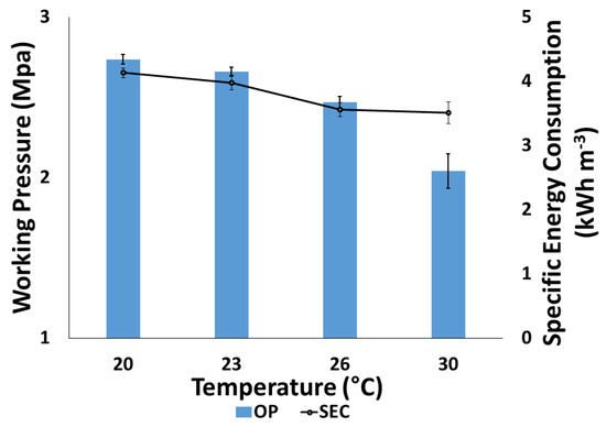 Figure 4 shows the working pressure and SEC of the RO system at different temperatures to obtain 7 LMH. It is possible to observe a reduction in working pressure and SEC at a higher temperature. This result is probably because the temperature has an essential influence on the surface energy of the membrane, determining the chemical potential of the water and, at the same time, the driving force through the membrane [43]. Furthermore, the water solubility and wettability of the membrane increase at higher temperatures [44], causing the water to pass through the membrane easier, reducing the membrane resistance, and thus reducing the working pressure and the SEC. Those results are beneficial for the desalinization process costs since when it consumes less energy, it may reduce water product costs, making RO desalination feasible for low-income regions.