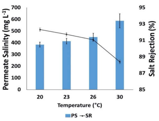 Figure 5 shows the results of permeate salinity and salt rejection. It is possible to observe salt rejection values of less than 99%, and this result may be due to the use of an RO membrane for seawater at low working pressures and low feed water salt concentration (5000 mg L−1). A reduction in salt rejection and an increase in permeate salinity are also observed at higher temperatures. These results are mainly due to the viscosity of the water decreasing at higher feed water temperatures, making the water flow more easily, and dragging more salts through the membrane, thus reducing its selectivity [45]. Furthermore, the RO membranes are made from polymers susceptible to high temperatures, which can suffer from irreversible swelling and strength the covalent bonds of the membrane compounds, facilitating the mass transfer through the membrane [46]. However, the permeate salinity values at 20, 23, and 26 °C are still in the range of permissible limits for human consumption according to the Mexican Official Norm (NOM-127-SSA1-1994) [47,48] and the World Health Organization (WHO) [49] (less than 500 mg L−1). The water permeated at 30 °C in this study would be used for agricultural, industrial and livestock activities.