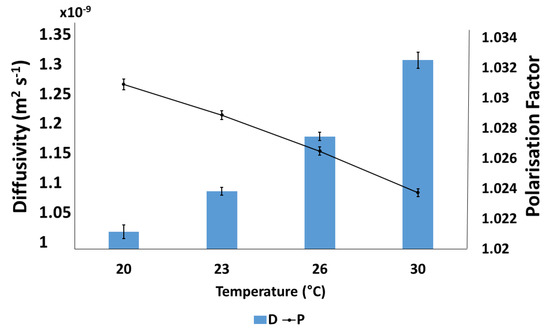 As regards the diffusivity and the polarization factor, Figure 6 shows the values obtained after the RO experiments. It is possible to observe that there was a statistically significantly higher polarization factor at 20 °C (at least 7% higher) with respect to 30 °C. These results are probably due to the higher salt rejection obtained at 20 °C (Figure 5) since the solute accumulation near the membrane surface is higher in comparison to the other studied temperatures [22]. However, the polarization factor values obtained are in the range of the typical concentration polarization values (≤2) [38], and this result may delay scaling on the membrane surface [19]. These results are desirable for desalination operations since they indicate that the membrane boundary layer has a lower salt concentration. Values of polarization factor ≥2 can decrease the observed salt rejection and increase the salt passage through the membrane, thereby reducing the water product quality. The higher polarization factor can be attributed to the osmotic pressure of water since it is influenced by the solute concentration difference between the feed and permeate channel [50], and it increases at lower temperatures [51]. Furthermore, the temperature directly influences the µ and ρ of the feed water, affecting the dimensionless numbers (Sh, D, Sc and NRe). Kmt depends on these numbers; thus, it increases at higher temperature values, decreasing the polarization factor value (see Equation (6)). The water diffusivity shows an increase at higher temperatures, which may be attributed to the diffusivity being directly related to the temperature and the dynamic viscosity of the feedwater [40]. An increase in the water diffusivity value is desirable as it increases the mass transfer coefficient through the membrane, leading to an increase in water product amount and reduction inthe SEC and operation pressure (Figure 5), which can decrease the desalination operational costs.