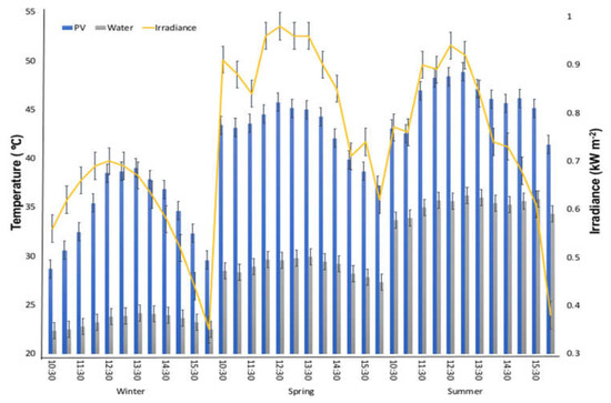 Figure 7 shows the irradiance, cooling water and PV temperature in winter, spring and summer. These results show non-uniform solar irradiance conditions in the spring and the summer seasons due to the fact that in these seasons, the natural phenomena called the North American Monsoon occurs in northwest México, which consists of rainfall and cloudy skies [52] and could interfere with the pyrometer reading. Furthermore, it is possible to observe a small increase in mean values of the PV temperatures in summer from 11:30 a.m. to 3:00 p.m. compared to the spring. With respect to cooling water temperatures, a highly significant increase is observed in the summer compared to spring and winter. These results can affect the power generation produced by the PV module since higher temperatures create hotspots that can degrade the photovoltaic cells, reducing the efficiency of the PV module [53].