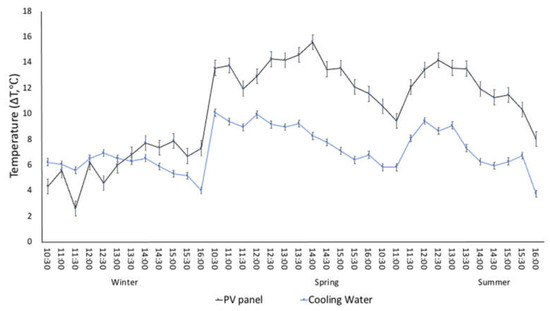 Figure 8 shows the temperature drop in the PV panel and cooling water before and after the cooling system. It can be observed that in winter, the temperature drop of the PV panel is lower than the cooling water from 10:30 a.m. to 13:30 p.m. This shows that the use of the cooling system is unnecessary before 13:30 p.m., as it does not provide savings to the system. It can also be observed that in summer there is a drastic decay in temperature drop from 12:00 to 15:00 p.m., probably because irradiation is lower during that period (see Figure 7). The largest temperature drop of the PV panel occurred in spring, indicating higher efficiency of the cooling system in this season of the year, which may help to increase the efficiency of the PV panel’s electrical energy production.