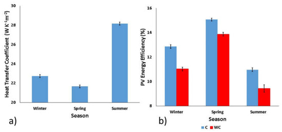 (a) Global heat transfer coefficient in different seasons of the year and (b) energy efficiency for the PV module in different seasons of the year. C = cooling system and WC = without cooling system.