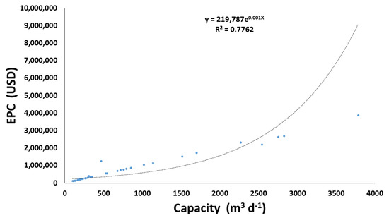 Figure 10 shows the exponential correlation of the cost of 38 installed reverse osmosis plants versus the installed capacity m3 d−1 of desalination plants using brackish water as feedwater in Mexico. The resulting equation provides an estimate of the initial investment cost or plant capacity installed or to be installed in the future.