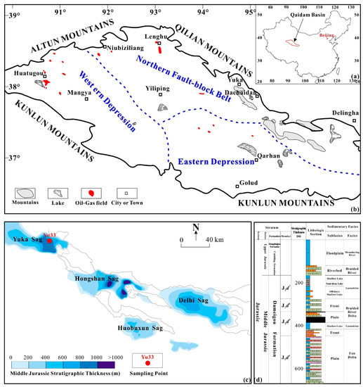 Location and geological features of the Yuka Sag, Qaidam Basin. (a,b) Location of the Qaidam Basin and distribution of the Qaidam Basin’s northern margin; (c) strata thickness of the Middle Jurassic in northern margin of the Qaidam Basin; (d) Jurassic lithostratigraphic section of the Qaidam Basin.