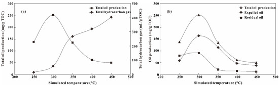 The diagram of simulated products: (a) changes in total oil production and total hydrocarbon-gas production during the simulation experiment and (b) comparison of total hydrocarbon, expelled oil and remaining oil.