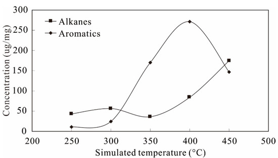 During the simulation experiment, the concentration of the alkane series did not show a flat increasing trend with the elevated temperature (Figure 3). It fluctuated in the low evolutionary stage (250–350 °C), while it enhanced rapidly and was positively correlated with the increasing temperature above 350 °C. The variation in the aromatics’ concentrations in the simulated experimental products showed a two-stage characteristic: a regular increase followed by a decrease. The concentration of aromatic hydrocarbons was significantly lower in the range of 250–300 °C and the aromatic series was lower than the alkane series, which indicated that the better the OM type, the lower the aromatic content (Table 1; Figure 3) during the “oil window” (300 °C, Ro = 0.84%). When the simulation temperature was less than 400 °C, the concentration of aromatics showed an increasing tendency with the elevated temperature, and reached its maximum value (271.50 ug/mg) at 400 °C. However, the aromatic concentration decreased rapidly above 400 °C (Figure 3).