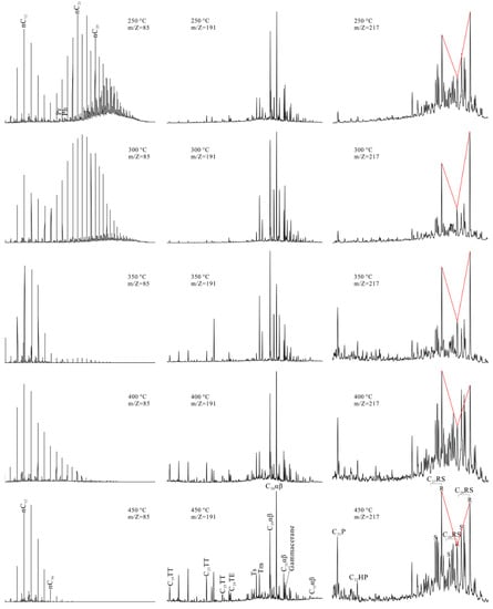 In samples of the simulation experiment, a wide range of steroidal compounds, such as pregnanes, rearranged steranes and regular steranes were detected (Figure 4). The relative abundances of pregnanes (C21 and C22) in the original samples and low-evolution samples (250–300 °C) were relatively low and the values of the ∑pregnanes/∑steranes were in the range of 0.05–0.11 (Table 3). However, after the simulation temperature rose to 350 °C, the ∑pregnane/∑sterane value increased rapidly and finally became stable (0.18–0.23). This implied that pregnanes were not degradation products of steranes; Liu et al. [29] held the same view. With the increasing temperature, the C27ααα20R/C29ααα20R ratio was relatively stable, although it rose to 0.86 at 450 °C. This suggested that the high-carbon sterane skeleton began to undergo a ring-opening cracking reaction. Mackenzie et al. [63] first proposed the ratios of C29ααα20S/(20S + 20R) and C29αββ/(αββ + ααα) to calculate maturity. However, Philp [24] pointed out that they had equilibrium values (0.52–0.55 and 0.67–0.71, respectively); when the balance value was exceeded, the information of maturity change was not reflected correctly. Currently, C29ααα20S/(20S + 20R) values and C29αββ/(αββ + ααα) values are the two most commonly used maturity and isomerization parameters [23,24].