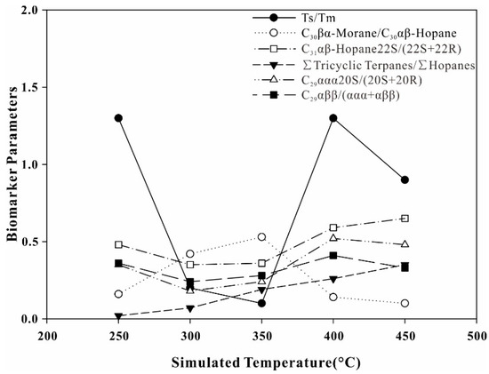 Tricyclic terpane has a wide distribution in sedimentary samples due to its isoprenoid side chain. Pentacyclic triterpene is also widely present in geological bodies; the pentacyclic triterpene with the hopane structure as the framework is an extensive biomarker [59,60]. Tricyclic terpane has attracted attention because of its high thermal stability and strong anti-biodegradability during evolution; van Graas [25] used the ratio of tricyclic terpanes/(tricyclic terpanes + hopanes) as the maturity index. In Figure 5, the ratio of ∑tricyclic terpanes/∑hopanes increases with the increasing temperature. Because of the small amount of tricyclic terpane in the original sample, the increasing tricyclic terpane was presumably mainly generated during thermal evolution [24,31]. Hence, the ratio of ∑tricyclic terpanes/∑hopanes could be used as a good maturity parameter for Middle Jurassic source rocks in the northern margin of the Qaidam Basin. The thermal stability of Ts (22, 29, 30-trisnorneohopane) is higher than that of Tm (22, 29, 30-trisnorhopane). Thus, the ratio of Ts/Tm can usually be used to indicate the degree of thermal evolution of organic matter [25,31,61]. However, the Ts/Tm value showed a complex variation trend: it increased first (250–300 °C) and then decreased with the increasing simulation temperature before increasing again. This was possibly because the Ts and Tm were cleaved during the heating, and the different ratios of the Ts and Tm suggested that they cracked at different rates. Furthermore, the formation of Ts and Tm might have occurred in the process of some high-molecular compounds cracking, which could have led to a relative content change in Ts and Tm.