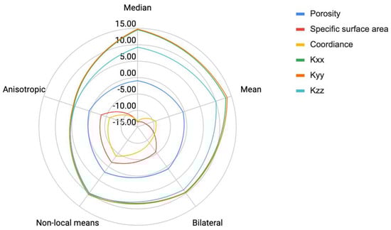 The median and mean filters exhibited limitations in terms of preserving edges and corners and generated step marching. They presented the greatest differences with Ilastik in terms of the specific surface area and permeability.